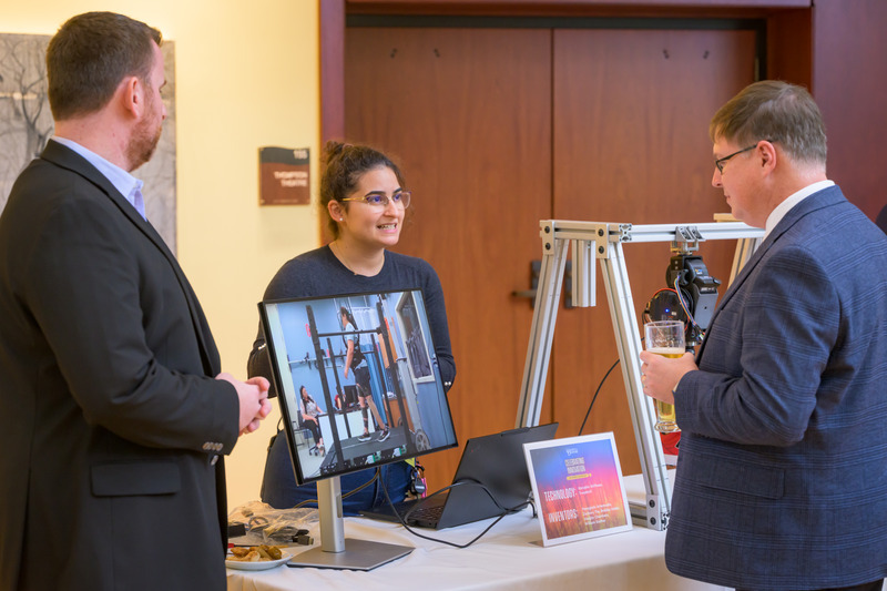 Charikleia Angelidou, a UD doctoral student in Panos Artemiadis’ lab (center), explains how intelligent controllers for ankle-foot prosthetics can help amputees experience a more natural walking pattern at the 2025 Inventor’s Recognition celebration.